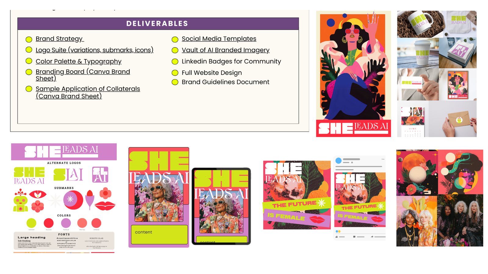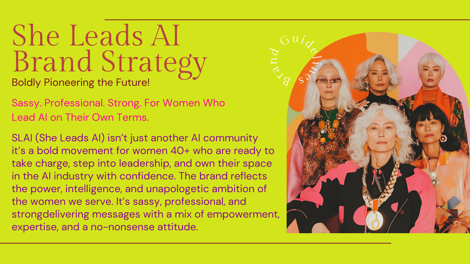 This wasn’t about being “nice” or “clean.” This was about building a powerful, unapologetic, sassy-but-strategic brand for women 40+ who are done waiting for a seat—and are now building the damn table.I had:- One call with the founder- Full creative freedom- Zero red tapeThat trust? It supercharged the creative process. She Leads AI needed a brand that looked the part—and sounded like it meant business.